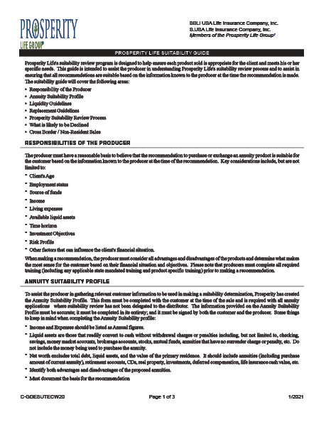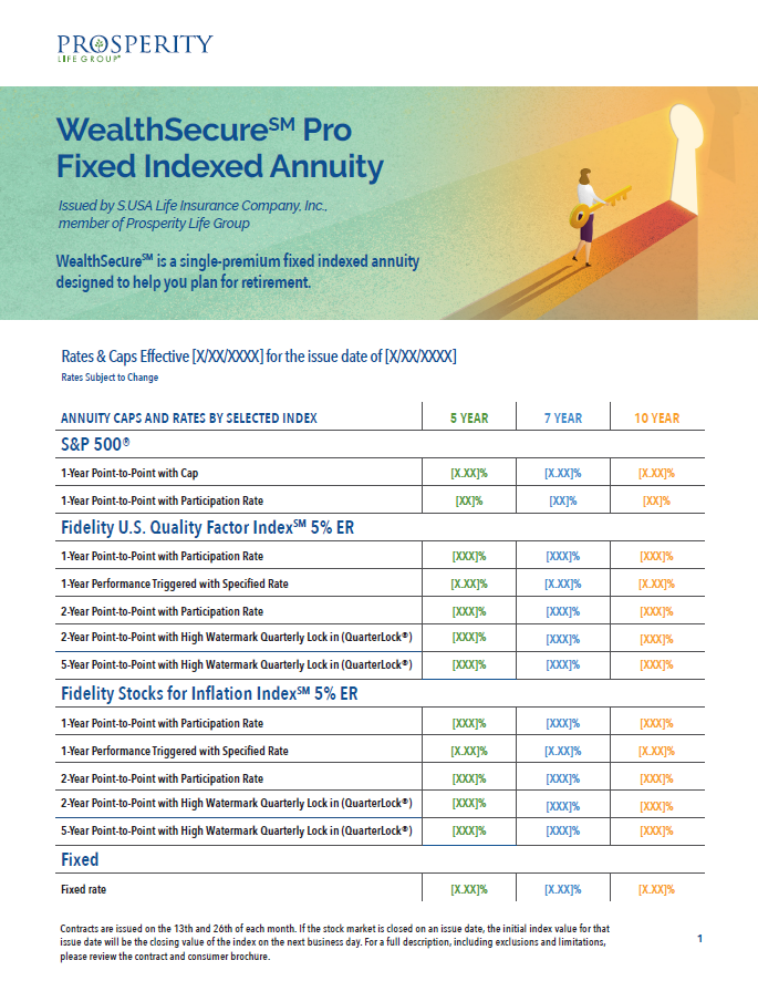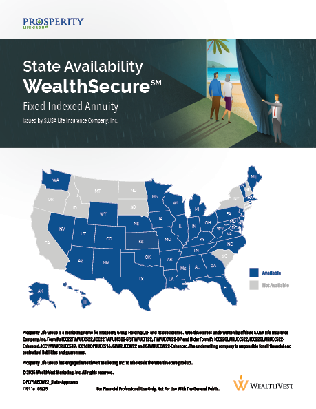Prosperity Life Group is a marketing name for certain affiliated companies. Life insurance and annuities are issued by SBLI USA Life Insurance Company, Inc. (SBLI USA), headquartered in New York, NY, and S.USA Life Insurance Company, Inc. (S.USA) headquartered in Roanoke, VA. Only SBLI USA is an authorized New York insurer. S.USA is not authorized as an insurer in, and does not do insurance business in New York. Each issuing company is responsible for its own financial and contractual obligations. SBLI USA Life Insurance Company, Inc. is not affiliated with The Savings Bank Mutual Life Insurance Company of Massachusetts or The Savings Bank Life Insurance Company of Connecticut. Prosperity Life Group has engaged WealthVest Marketing Inc. to wholesale products underwritten by the Member Companies.