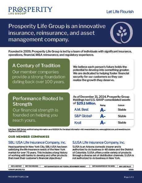 Prosperity Life Group is a marketing name for certain affiliated companies. Life insurance and annuities are issued by SBLI USA Life Insurance Company, Inc. (SBLI USA), headquartered in New York, NY, and S.USA Life Insurance Company, Inc. (S.USA) headquartered in Roanoke, VA. Only SBLI USA is an authorized New York insurer. S.USA is not authorized as an insurer in, and does not do insurance business in New York. Each issuing company is responsible for its own financial and contractual obligations. SBLI USA Life Insurance Company, Inc. is not affiliated with The Savings Bank Mutual Life Insurance Company of Massachusetts or The Savings Bank Life Insurance Company of Connecticut.
