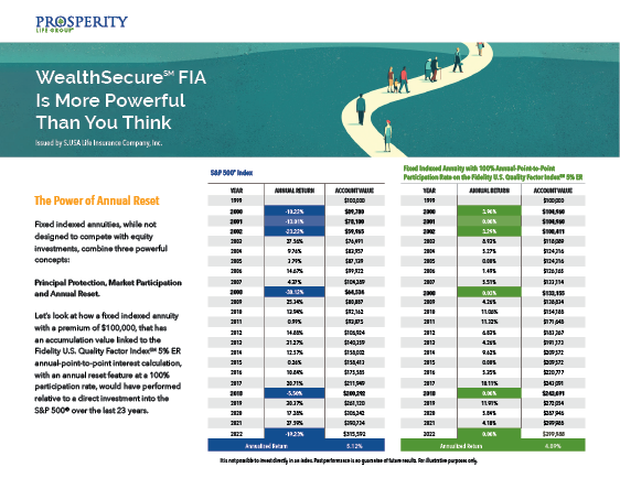 WealthSecure Pro is issued by S.USA Life Insurance Company, Inc., Form #’s ICC22FIAPUECS22, ICC22FIAPUECS22-DP, FIAPUECW22-DP, FIAPUEFL22, FIAPUEFL22-DP and Rider Form #’s ICC22GLWRUECS22, ICC22GLWRUECS22-Enhanced, ICC19WWCRUECS19, GLWRUECW22 and GLWRUECW22-Enhanced. Not licensed in all states. Product not available in all states. Features may vary by state. S.USA is solely responsible for its contractual and financial obligations.